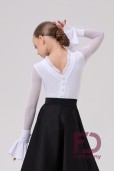 The swimsuit is made of white supplex, with long sleeves from soft mesh, with a decorative strip along the back, decorated with buttons. Fastening at the bottom with buttons.