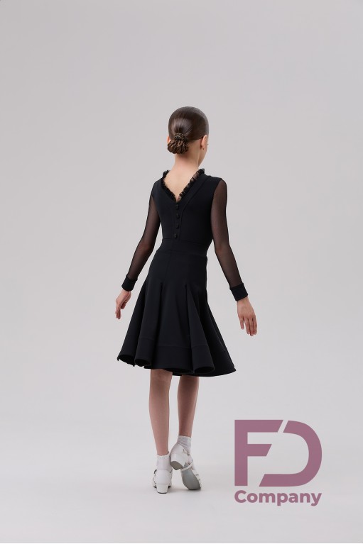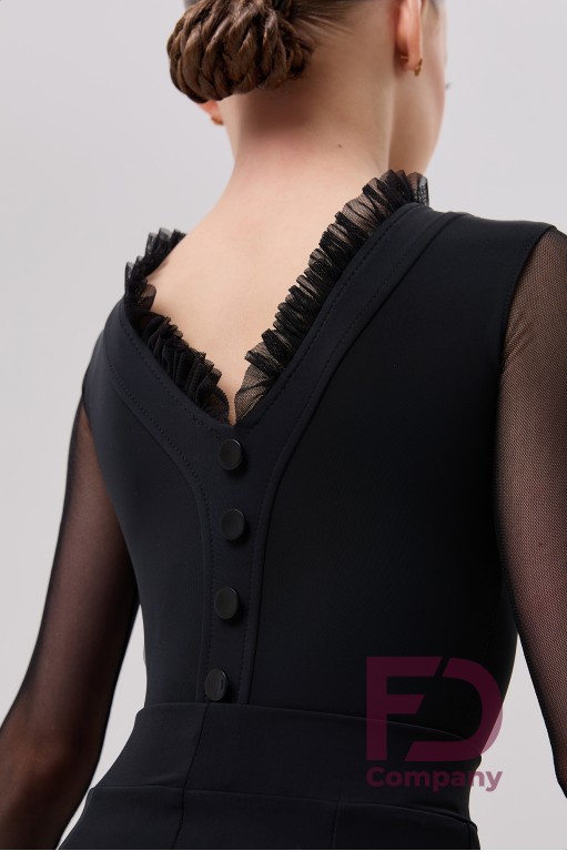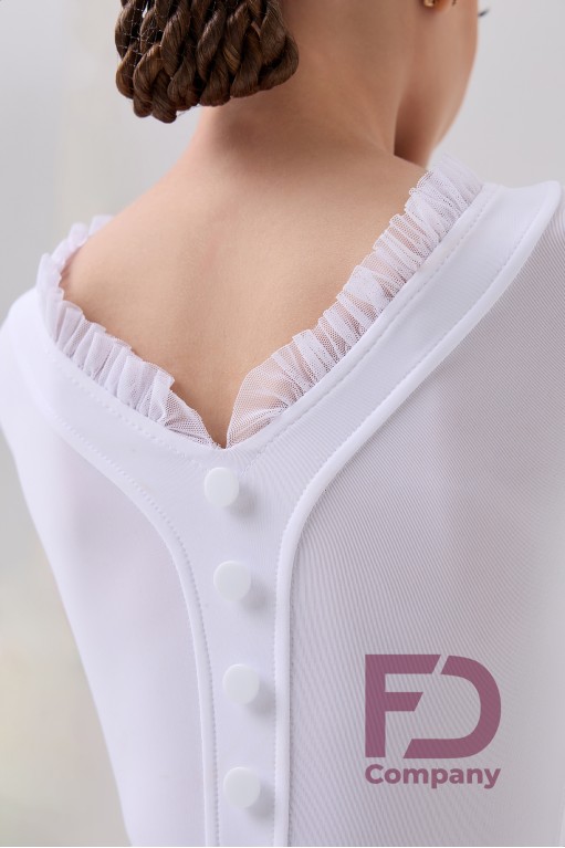 Swimsuit with long sleeves made of mesh, V-shaped neckline on the back. The decorative back panel is decorated with buttons. Fastening at the bottom with buttons.