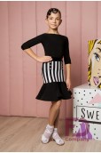 Product descriptionWomen's swimsuit, with a three-quarter sleeve, a boat-shaped neckline in front and an open back, with a button fastening at the bottom. The product is made of oil jersey, velor stripes are sewn on the shoulder and sleeve.