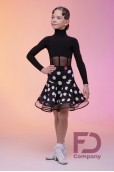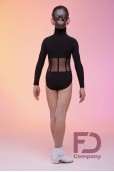Product descriptionLeotard for women, with long sleeves, high stand-up collar, with fastening with buttons at the bottom. The product is made of oil jersey, on the front and back there is an insert from a stretch mesh with a stitched velor tape imitating a corset.