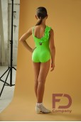 Product descriptionWomen's leotard, with straps, with an open back, with a button fastener at the bottom, a draped ruffle sewn on the right shoulder, made of basic fabric. The product is made of plain oil jersey.