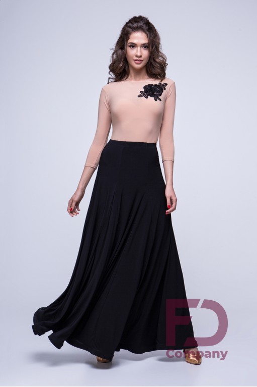 Product descriptionWomen's leotard, classic, with a button fastener at the bottom, with three-quarter sleeves, with a semicircular neckline and an open back. The product is made of oil jersey and decorated with an applique in the shape of a flower with sequins.