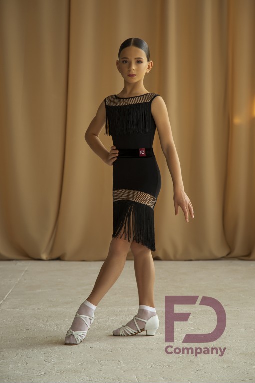 Product descriptionLeotard for women, with stitched yokes made of a large mesh, duplicated with beige jersey, sleeveless, open back, with a button fastener at the bottom. The product is made of oil jersey, the armholes and the neck are finished with an elastic band. At the base of the front yoke, a 15 cm long fringe is sewn (32-36 size), 20 cm (38-52 size).
