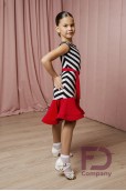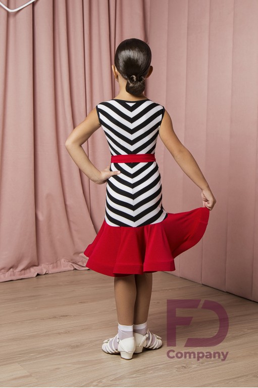 Product descriptionDress for latin semi-adjacent silhouette, above the knee length, without sleeves, without a collar, with a sewn shuttlecock, asymmetrical bottom processed with a regilin 3 cm wide in hem, removable belt, panties included. On the front and back with a medium seam. The product is made of printed jersey with black and white stripes, flounce - colored jersey with oil, armholes and neckline are finished with an elastic band.