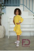 Product descriptionDress for latin, close-fitting silhouette, made of oil jersey. One-piece sleeve, three-quarters length, with stitched cuffs. The product is on one shoulder, a piping with an elastic band 2 cm wide is sewn along the neckline. The bottom of the dress is asymmetric, with a stitched flounce, with a regilin 3 cm wide. Panties included.