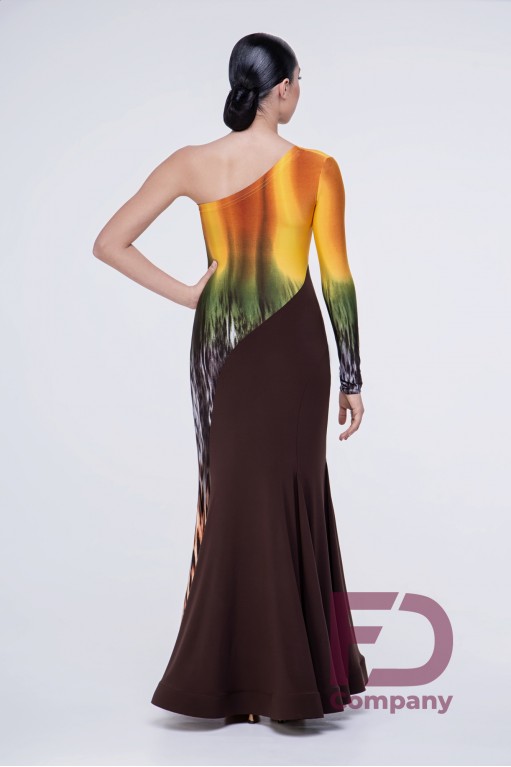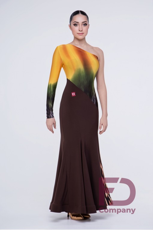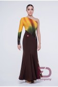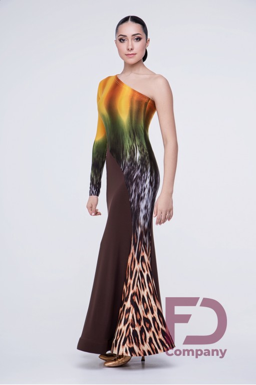 Product descriptionDress for a standard, close-fitting silhouette, flared to the bottom, long sleeves, one shoulder. An elastic band 2 cm wide is sewn along the neckline into the hem, the bottom of the product is processed with a 5 cm wide elastic band at the hem. The product is made from a combination of a printed coupon jersey and a plain oil jersey.