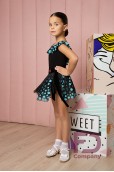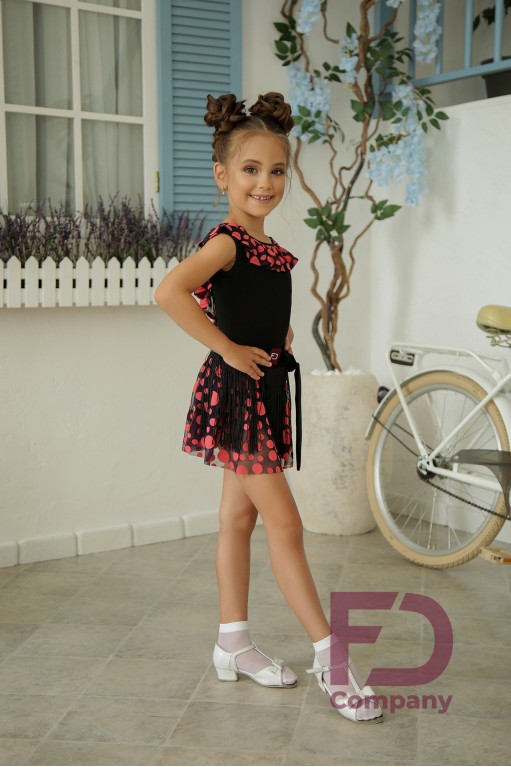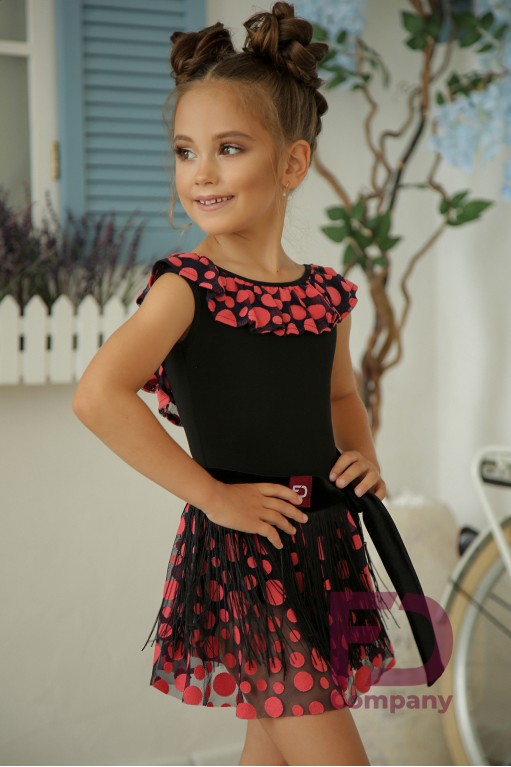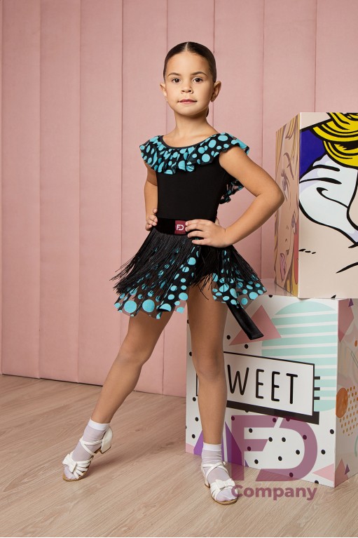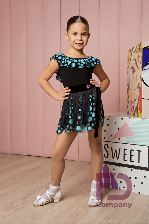 Product descriptionWomen's belt for ballroom dancing, made of velor, with a stitched skirt made of mesh fabric in polka dots, on the top of the skirt there is a fringe 20 cm long, in two layers.