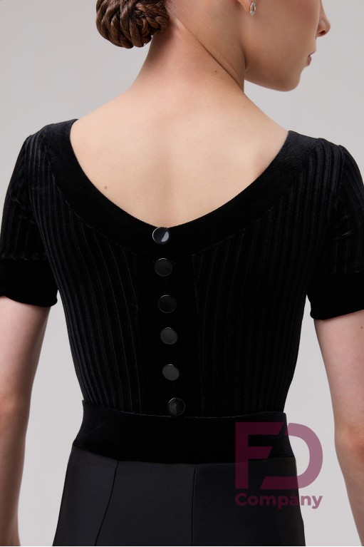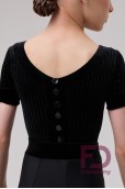 Купальник выполнен из велюра в полоску и велюра, с V - образным вырезом по спинке и коротким рукавом. Спинка украшена пуговицами. Застежка внизу на кнопки.