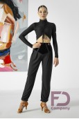 Описание товараБрюки для латины, на кокетке из велюра, украшеной вертикальными полосками из трикотажа масло. Брюки зауженные к низу на манжете. По переду и спинке заложены склады. Изделие выполнено из трикотажа масло.