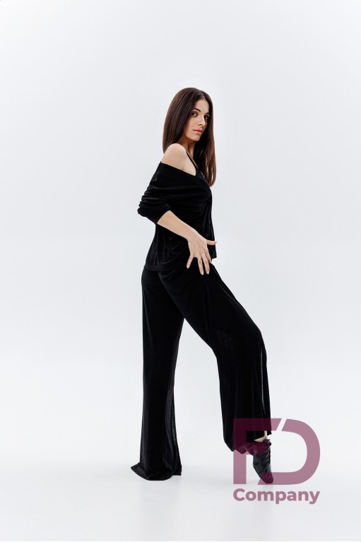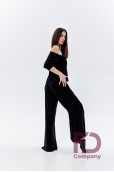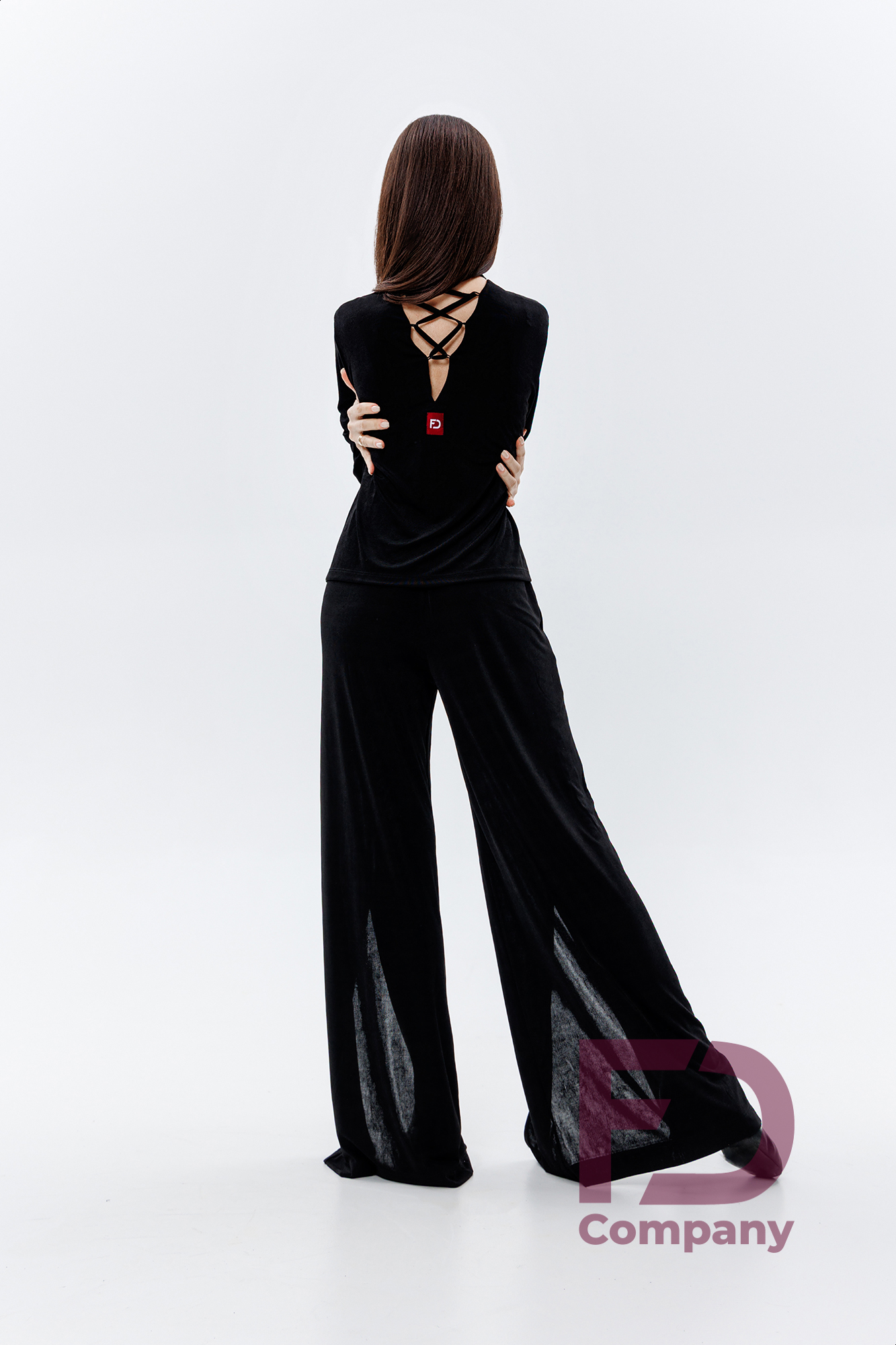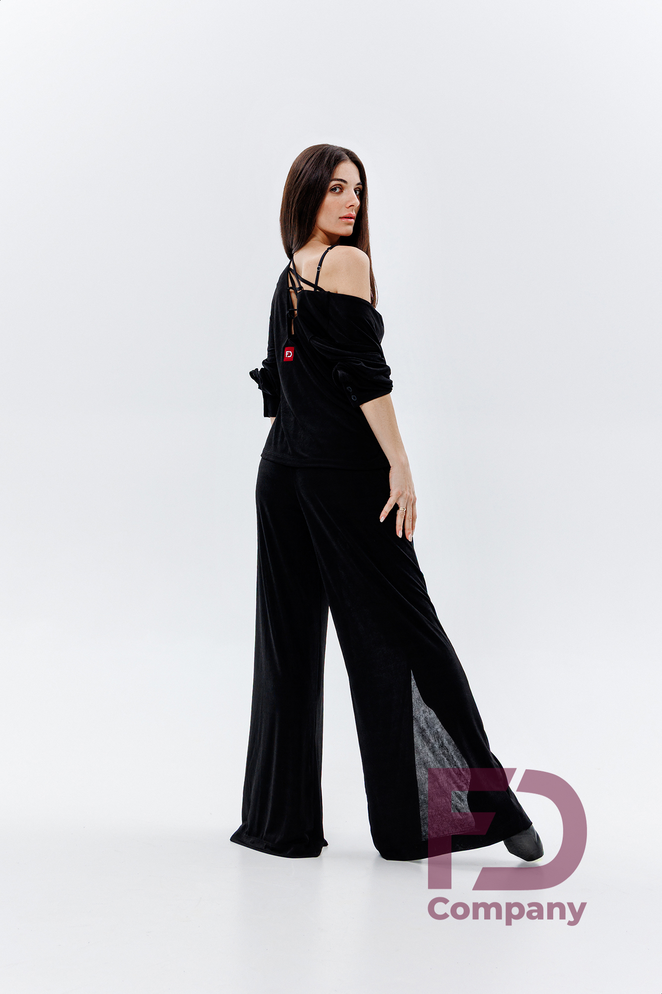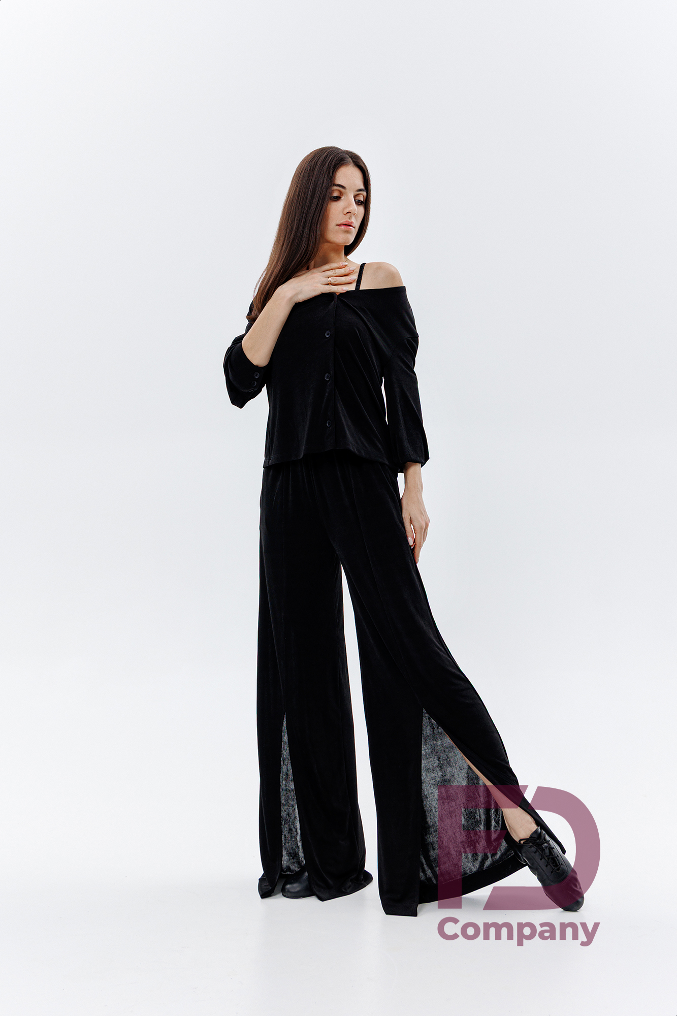 - Особенности: Брюки расклешенного кроя от бедра с цельнокроеным поясом на резинке шириной 5 см. На передних половинках — разрезы, карманы расположены по боковым швам.;