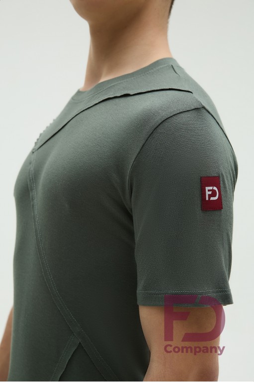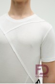 - Особенности: Футболка прямого силуэта. Перед разрезан на ассиметричные части с открытыми срезами.;