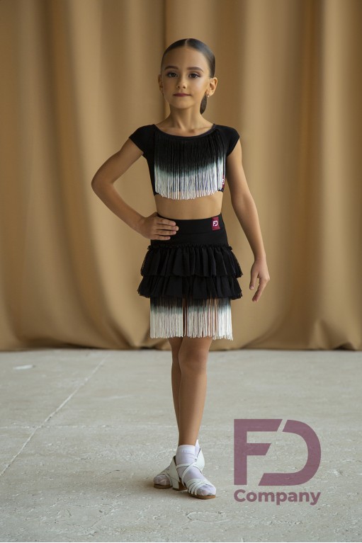 Описание товараЮбка для латины, с притачным поясом с резинкой шириной 4 см., асимметричным низом, трусы вшиты. Изделие выполнено из трикотажа масло, с двумя рядами оборок из сетки - стрейч, украшена бахромой длиной 20 см., черно - белый градиент.