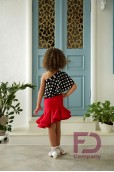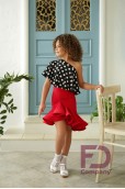 Описание товараЮбка для латины, на кокетке, асимметричной формы, с притачным поясом, с резинкой шириной 4 см., с притачным воланом, низ волана обработан регилином шириной 3 см. в подгиб. Трусики вшиты. Изделие выполнено из трикотажа масло.