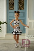 Описание товараЮбка для латинских танцев с трусиками и резинкой шириной 3 см по линии талии. По центру переда и спинки юбки выполнена драпировка, к низу юбки пришиты два ряда воланов, обработанные косой атласной бейкой шириной 1.5 см. Юбка выполнена из трикотажа масло черный горох средний, трусики выполнены из трикотажа масло белого цвета.