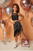 Описание товараЮбка имитирующая завязаный платок, предназначенная для латинских танцев, на трусиках, с притачным поясом с резинкой 4 см. По нижнему срезу украшена декоративной бахромой. Юбка выполнена из трикотажа масло средний белый горох.