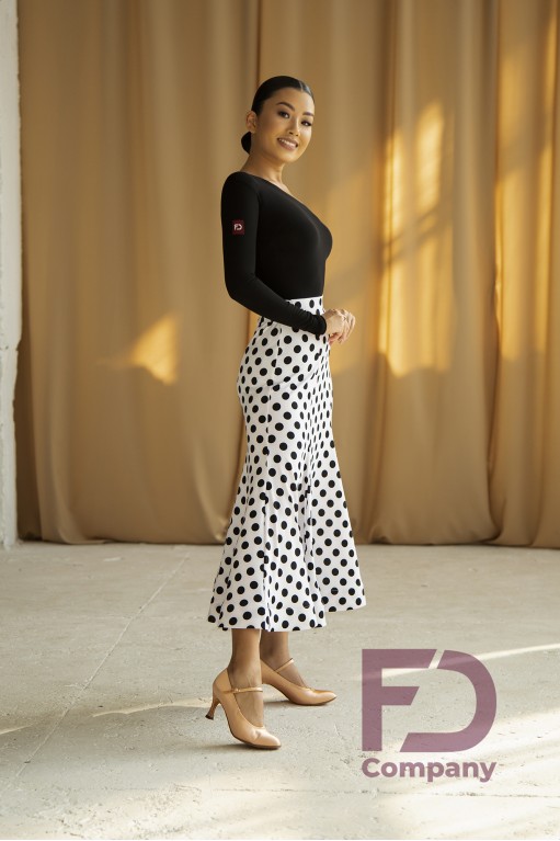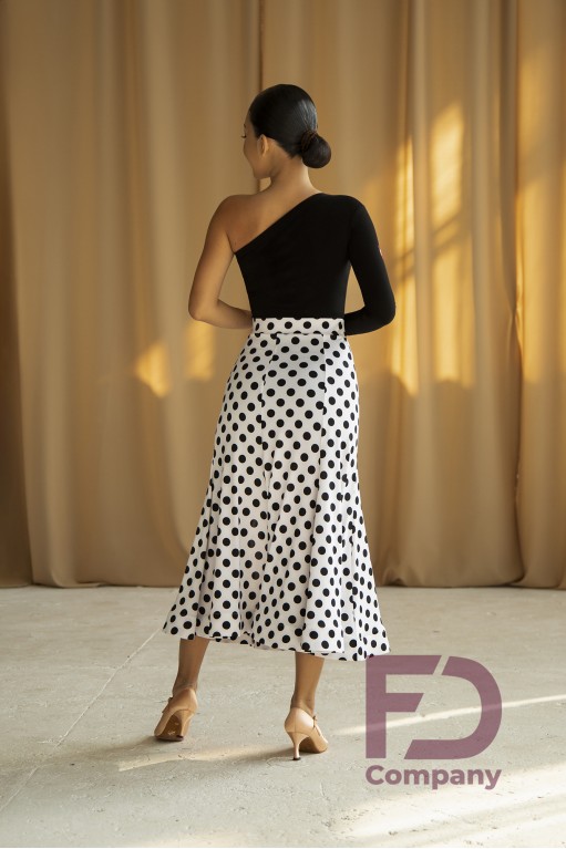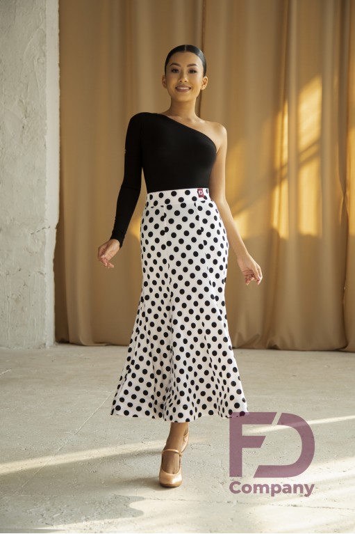Описание товараЮбка для стандарта из шести клиньев, крой годе, притачной пояс с резинкой шириной 4-5 см. Низ изделия обработан регилином шириной 5 см. в подгиб. Юбка выполнена из трикотажа масло принт горох.