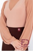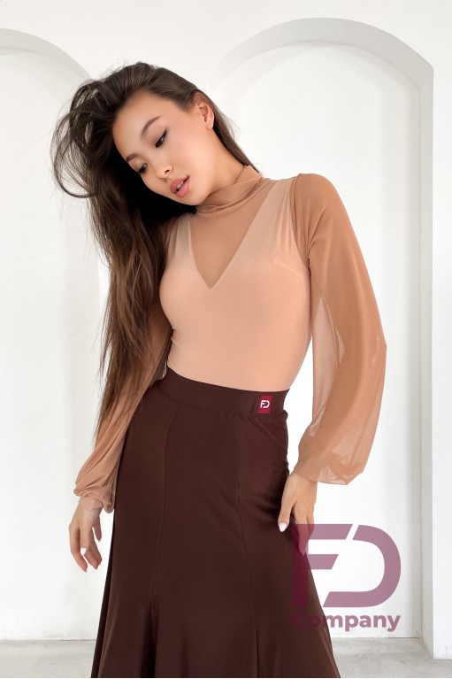 Описание товараКупальник женский, с длинным расклешенным рукавом, с манжетой, высокий воротник стойка, с застежкой на кнопки внизу. Изделие из комбинации двух тканей, сетка и трикотаж масло.