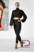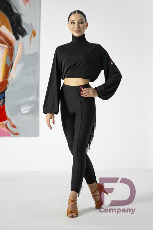 Описание товараЛосины укороченные для латинской программы, на поясе с резинкой. По переду объемная стрелка, по задним половинкам в вертикальный рельеф вшита бахрома. Изделие выполнено из трикотажа масло.