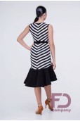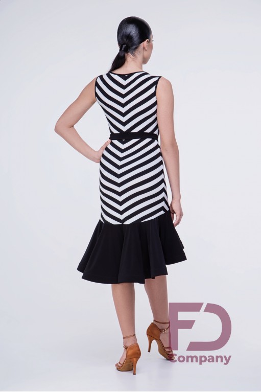 Описание товараПлатье для латины полуприлегающего силуэта, длиной выше колена, без рукавов, без воротника, с притачным воланом, ассиметричным низом обработанным регилином шириной 3 см. в подгиб, пояс съемный, трусы в комплекте. По переду и спинке с средним швом. Изделие выполнено из принтованного трикотажа в черно белую полоску, волан - трикотаж масло, проймы и горловина обработаны бейкой резинкой.