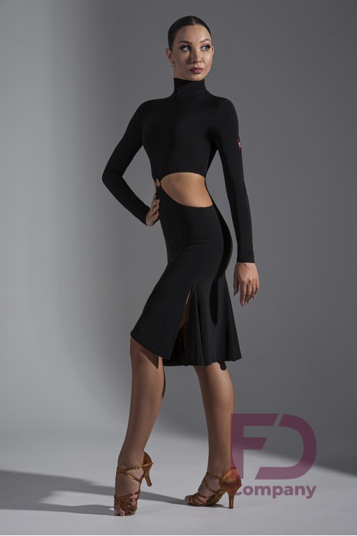 Описание товараПлатье для латины прилегающего силуэта, длинным рукавом, воротником стойка, с вырезами по бокам, в средний шов спинки втачина потайная молния. Юбка из четырех клиеньв с разрезами в каждом шве. Лиф с юбкой скреплены декоративными металлическими кольцами. Трусики вшиты. Изделие выполнено из трикотажа масло.