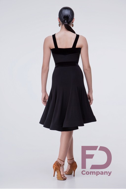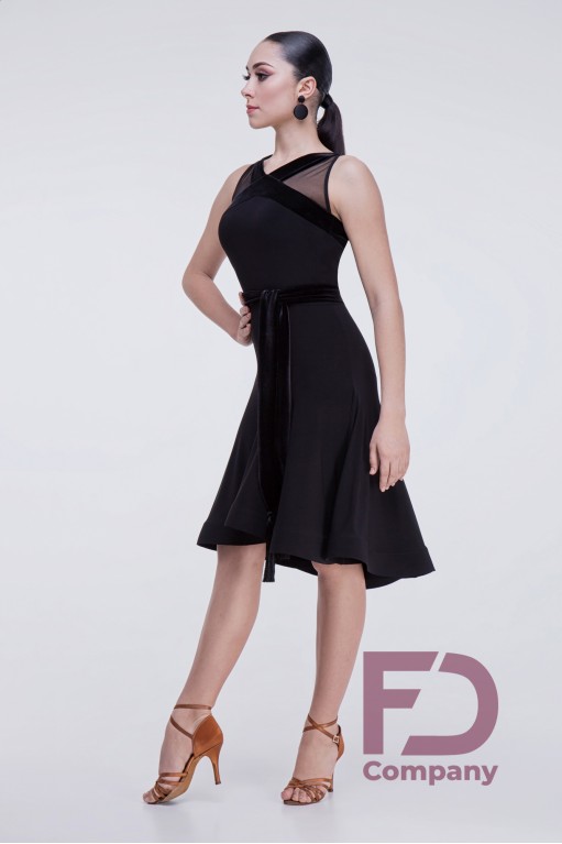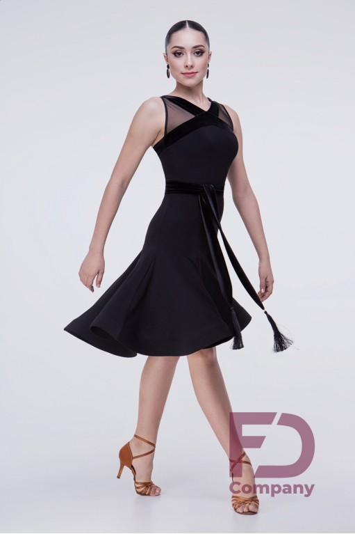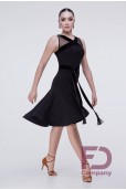 Описание товараПлатье для латины с ассиметричным низом, без рукавов, v - образной горловиной впереди и бретелями по спине, отрезное по талии. Юбка из шести клиньев, низ обработан регилином шириной 3 и 5 см. в подгиб. Трусы в комплекте. Изделие из трикотажа масло, обтачки горловины и бретели из мягкого велюра, кокетки верха переда из сетки стрейч. Съемный велюровый пояс с кисточками на концах прилагается.