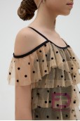 - Особенности: Платье-комбинезон свободного силуэта со спущенными плечами на бретельках, по переду и спинке воланы из сетки флок мелкий горох. В размерах 36-50 - чашечки в комплекте.;