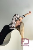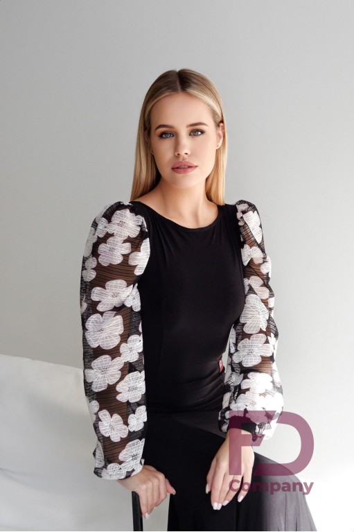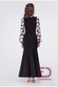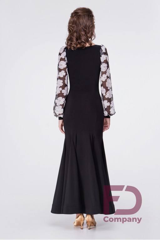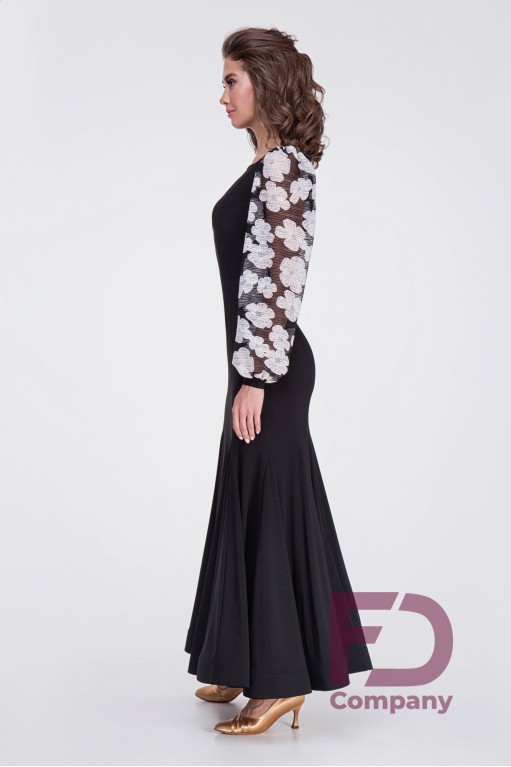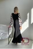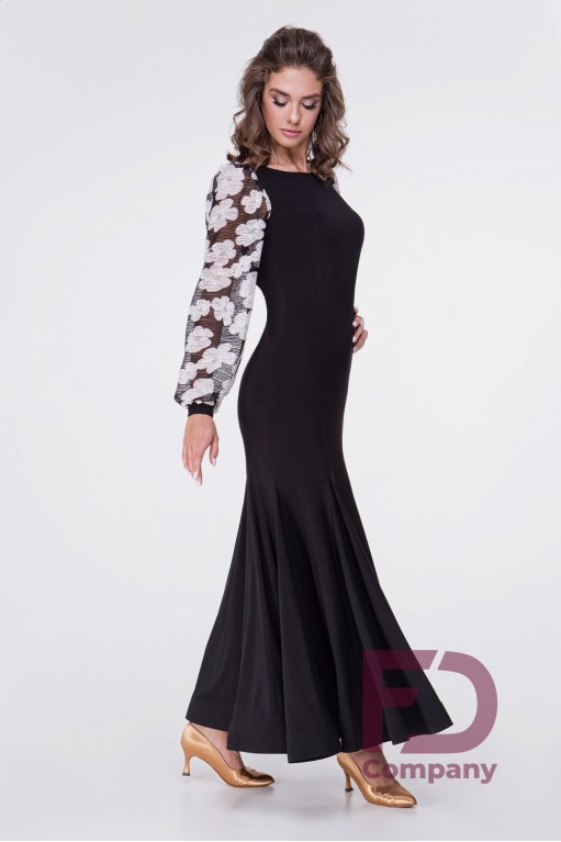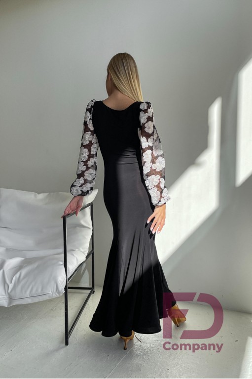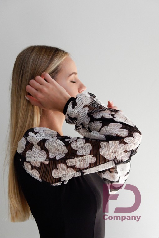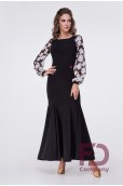 Описание товараПлатье для стандарта прилегающего силуэта, расширенное к низу, длинным широким рукавом с манжетом, горловиной в форме "лодочка". По переду и спинке рельефные швы, юбка с вставками "годе" во всех швах, низ изделия обработан регилином шириной 5 см. в подгиб. Изделие выполнено из трикотажа масло, рукава из принтованной сетки белые цветы. По горловине вшита резинка шириной 0.5 см.