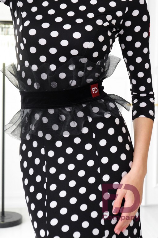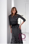 Описание товараПлатье для стандарта прилегающего силуэта. Рукав узкий, длиной три четверти. Горловина о - образной формы. По переду и спинке выполнены рельефные швы с клиньями, низ обработан открытым регилином шириной 5 см. Платье выполнено из трикотажа принт горох. Пояс в комплект не входит.