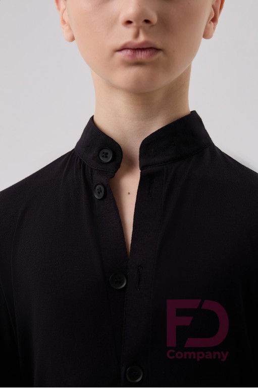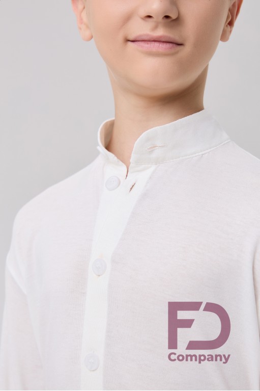 - Особенности: Рубашка свободного силуэта. Полочка с цельнокроеной планкой, центральной застежкой на пуговицы. В боковых швах разрезы, обработанные киперной лентой.;