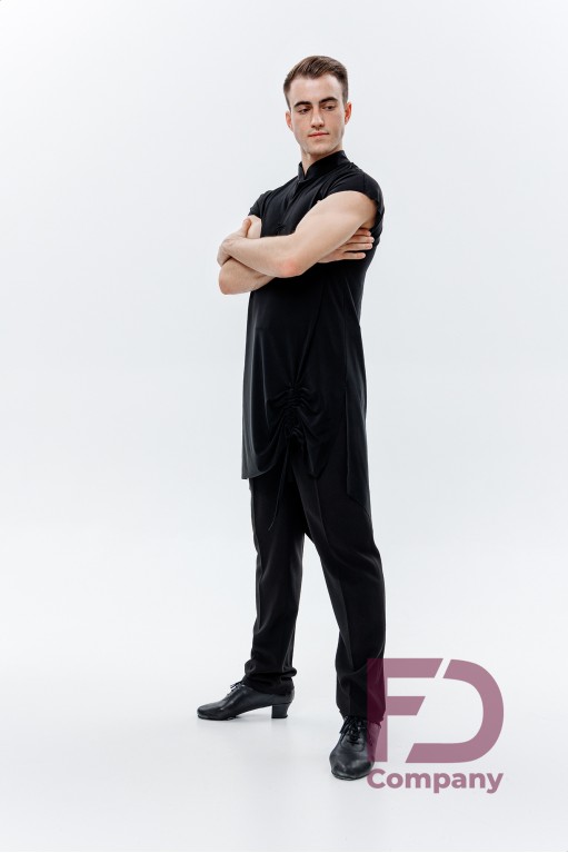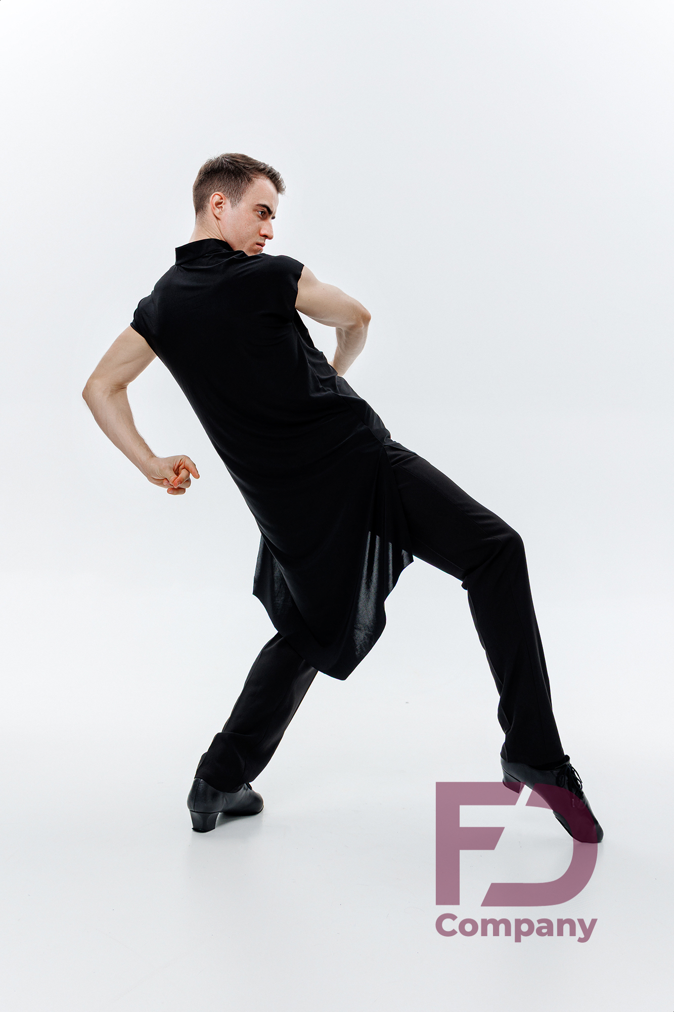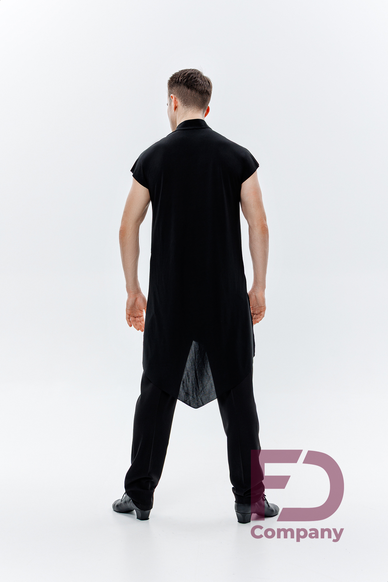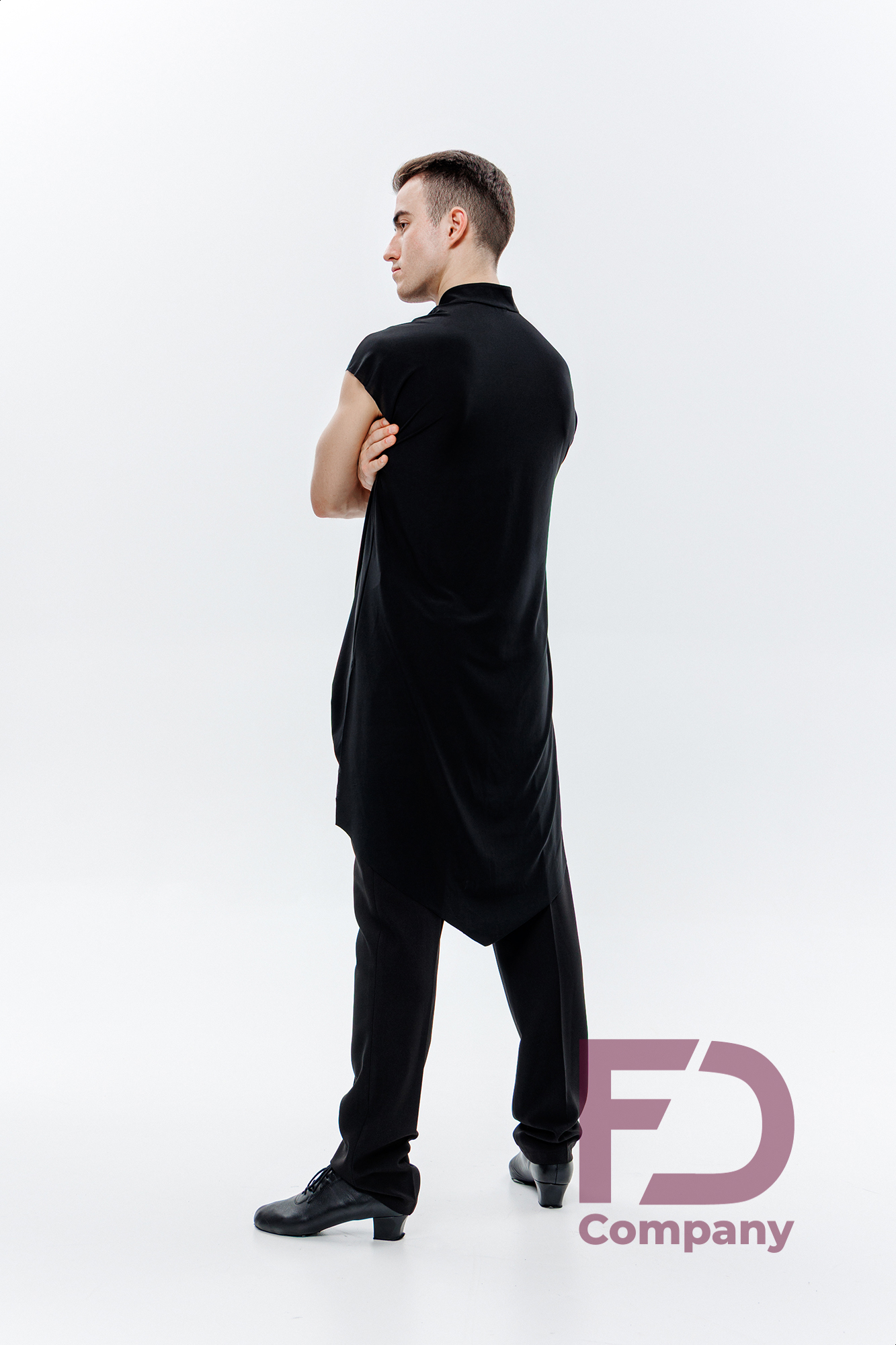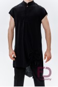 - Особенности: Туника без рукавов, перед с отрезной кокеткой и планкой с имитацией застёжки. Воротник — стойка. Низ изделия асимметричный, с разрезами по боковым швам. По переду выполнена кулиска с завязками для регулировки длины изделия. Срезы низа изделия и пройм не обработаны.;