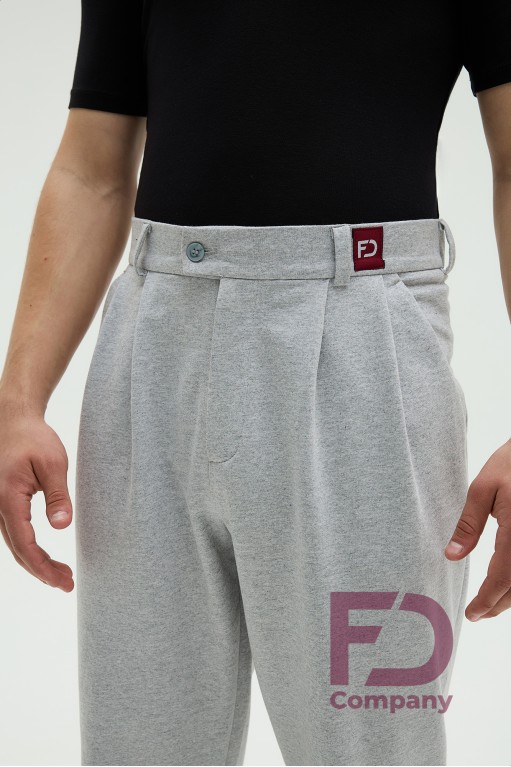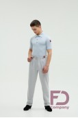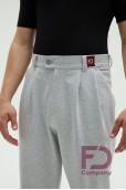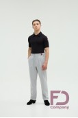 - Особливості: Штани звужені до низу. На передніх половинках дві складки закладено до бокових швів. З боків кишені. На задніх половинках виточки та кишені (пензлик обманка). По поясу шльовки, на поясі застібка на один верхній і один внутрішній гудзик. Пояс із гумкою між бічними швами.;