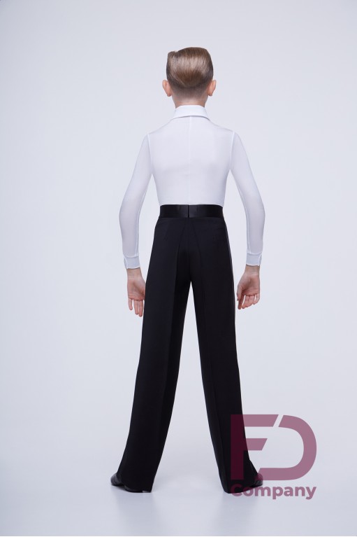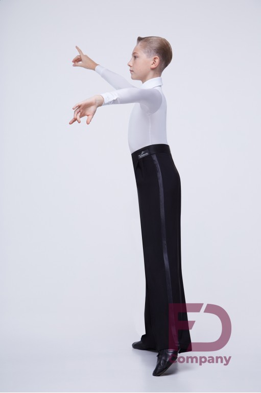 Опис товаруБрюки дитячі для стандарту, виконані з тканини габардин. Попереду і ззаду брюк стрілки відстрочені обробної рядком 0.1 см. Пояс притачной атласний із застібкою на гачках, з атласними лампасами. Дитячі розміри.