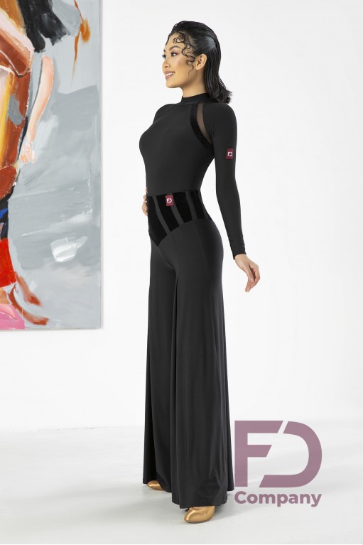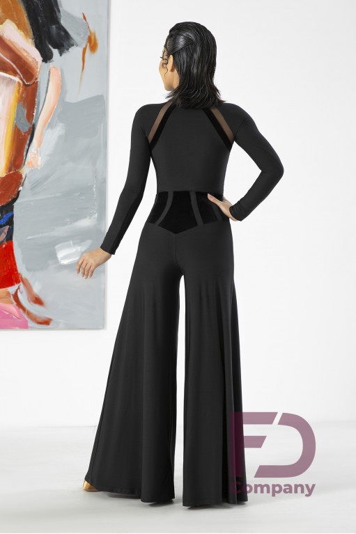 Опис товаруШтани для стандарту, з декоративною кокеткою з велюру, прикраси вертикальними смужками з трикотажу масло. Штани широкі, клешение до низу, із зустрічними складами по переду. Виріб виконаний з трикотажу масло.