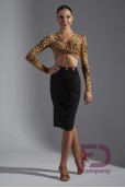 Опис товаруСпідниця для латини прямого силуету з притачним поясом із гумкою шириною 3 см. На передньому полотнищі спідниці притачна кокетка із зашитими складами зліва. По лінії приточування нижньої деталі переда закладені м'які склади. По лівому боковому шву зроблено розріз. Боягузи вшиті. Виріб виконаний із трикотажу масло.