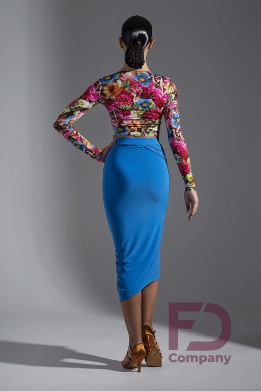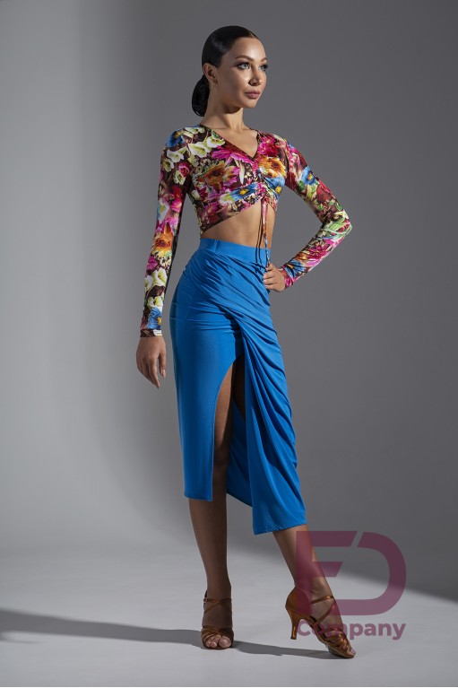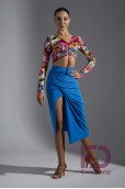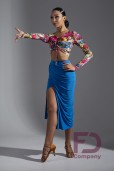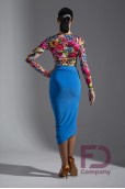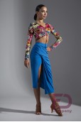 Опис товаруСпідниця для латини звужена до низу, на запах, по верхньому зрізу закладені м'які склади, пояс притачной з гумкою шириною 3 см., труси вшиті. Виріб виконаний з кольорового трикотажу масло, пояс з велюру.