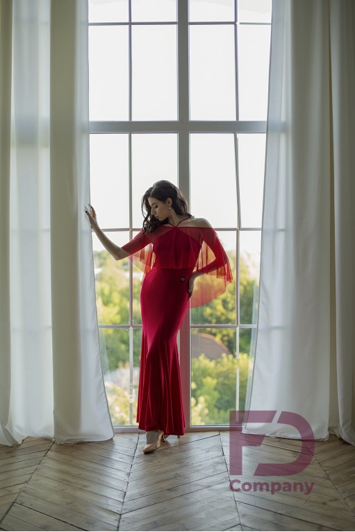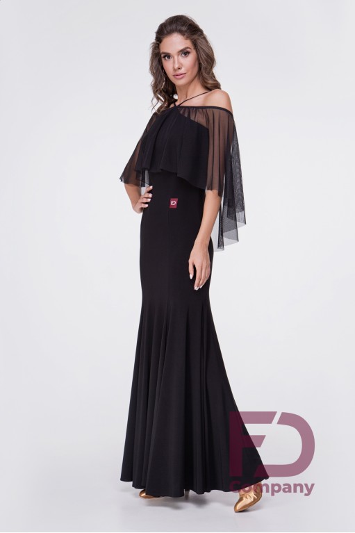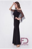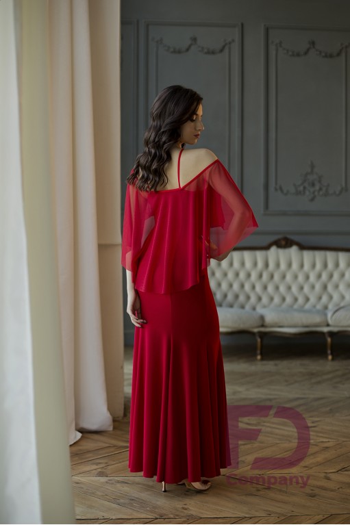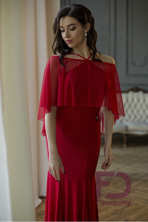 Опис товаруСукня для стандарту прилеглого силуету, розкльошені до низу, без рукавів, відкритою спиною, на тонких бретелях, з пелериною з сітки стрейч. За переду і спинці виконані рельєфні шви. Виріб виконаний з трикотажу масло.