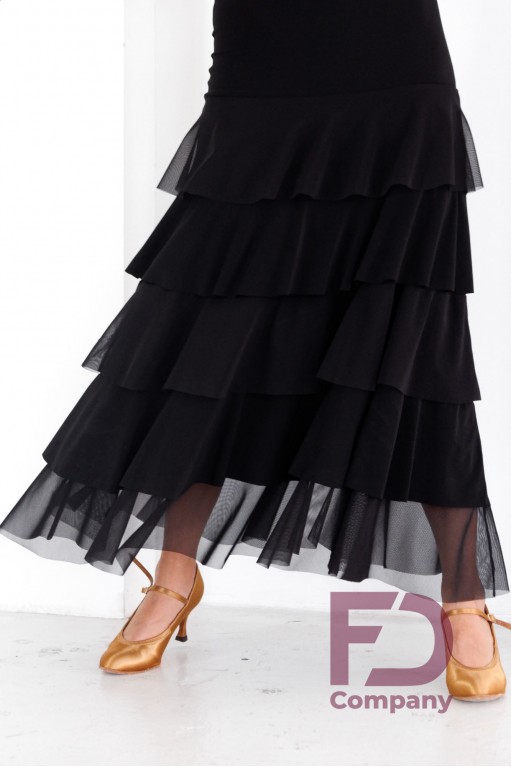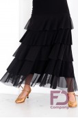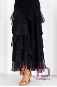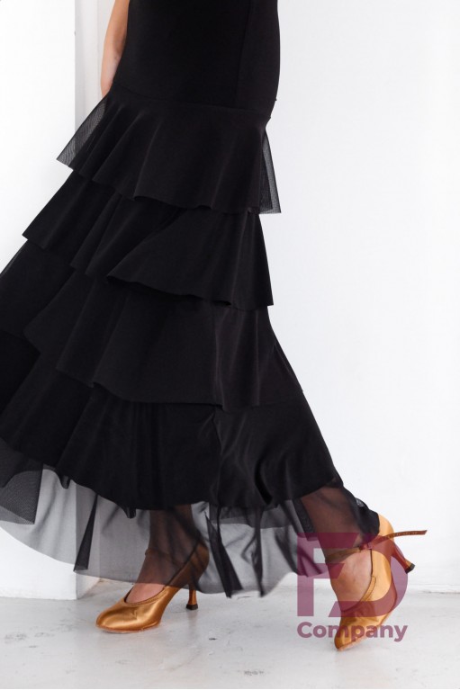 Опис товаруСукня для стандарту, прилеглого силуету, без рукавів, з круглим вирізом горловини та відкритою спиною. За талії декоративний пояс-драпірування, спідниця трапеція прикрашена воланами. Виріб виконаний з трикотажу масло і стрейч сітки.