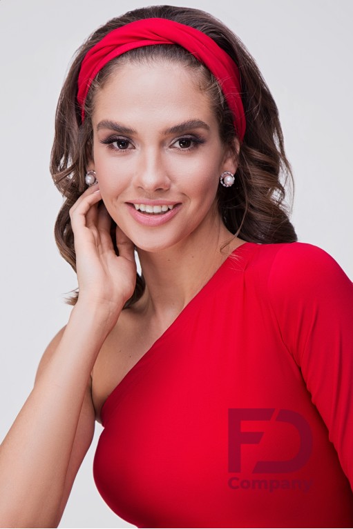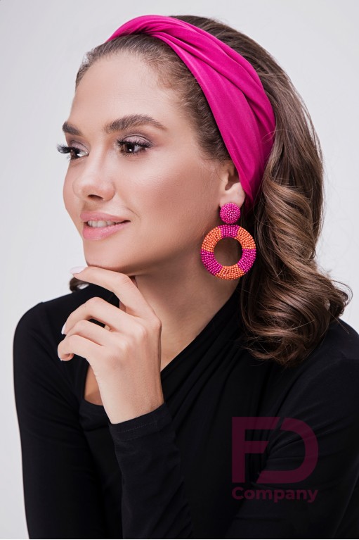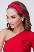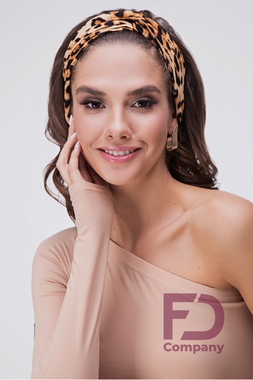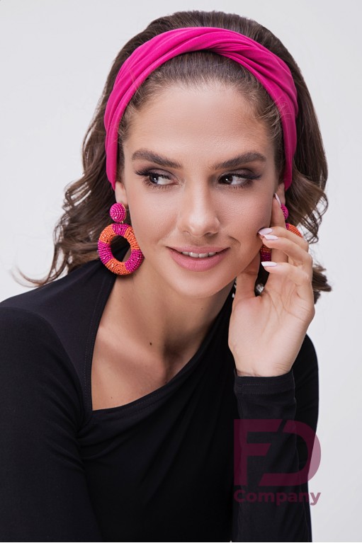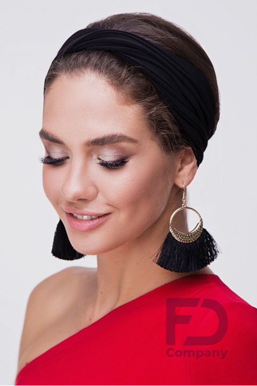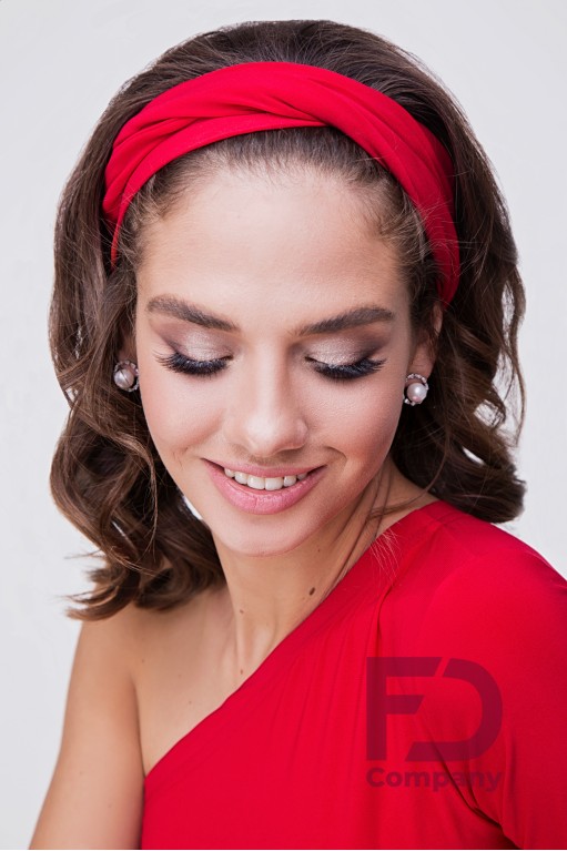 Опис товаруПов'язка на голову, по центру драпірування з подвійним перекрутив, виконана з тканини трикотаж масло.