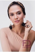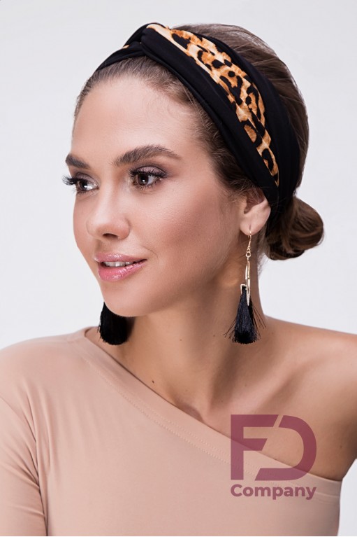 Опис товаруПов'язка на голову, по центру драпірування з подвійним перекрутив, виконана з тканини трикотаж масло двох кольорів: однотонне і прінтована.