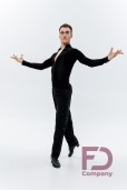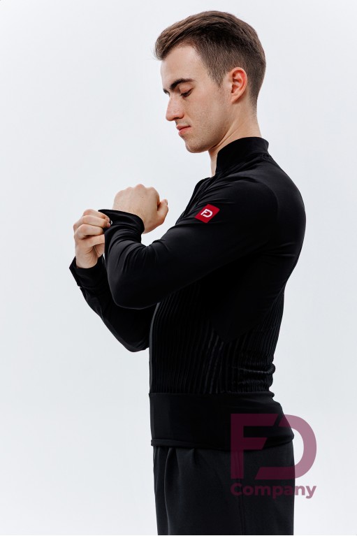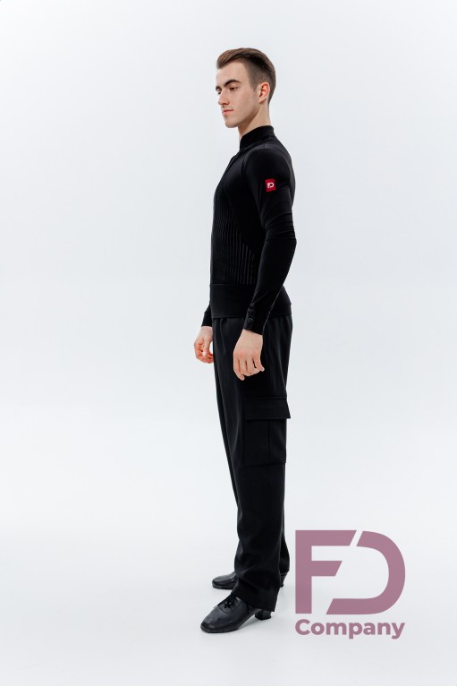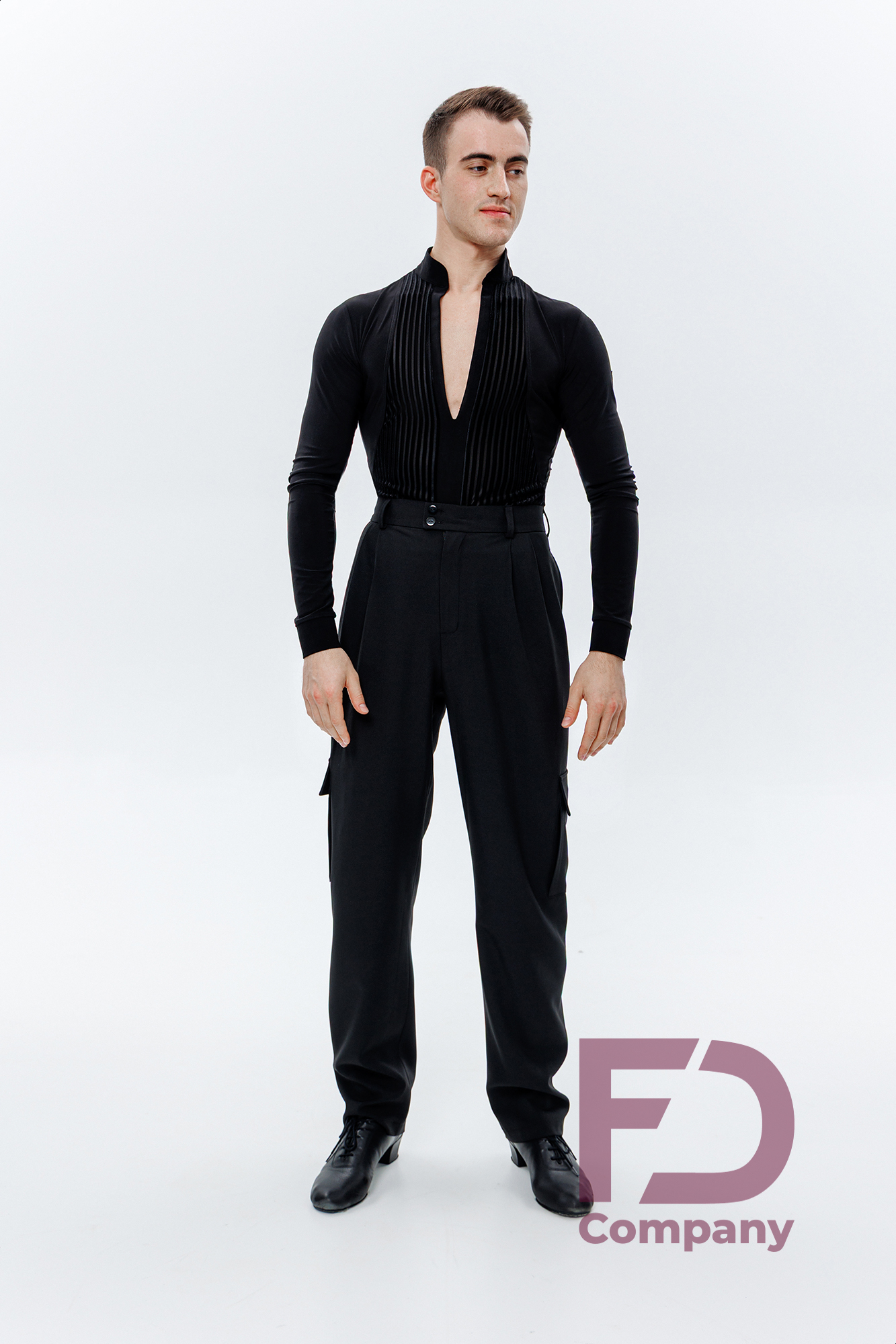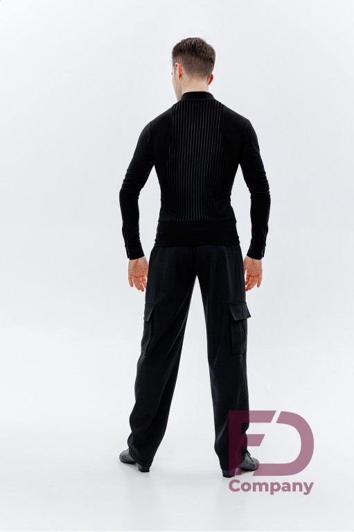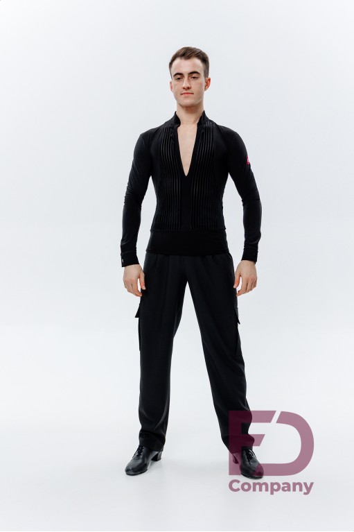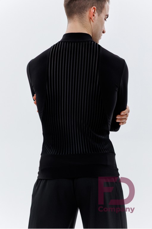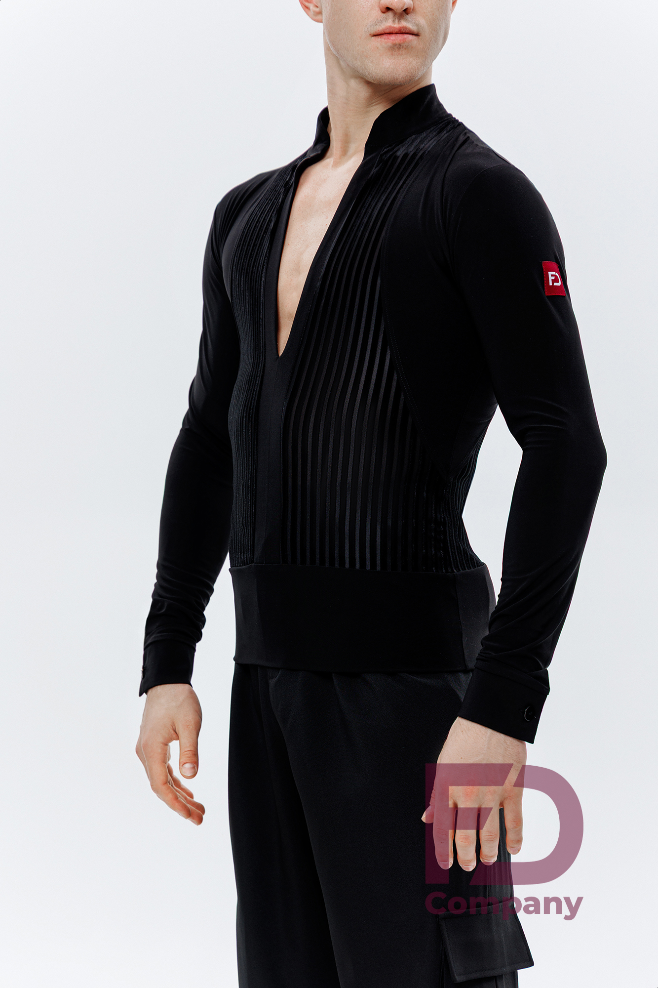 - Особливості: Сорочка зі стрейч трикотажу та велюрової сітки в смужку. Без центральної застібки, з V-подібною горловиною, комір — стійка. Рукав довгий, втачний, одношовний, з притачним манжетом, що застібається на петлю і ґудзик. Низ виробу оброблений притачною манжетою.;